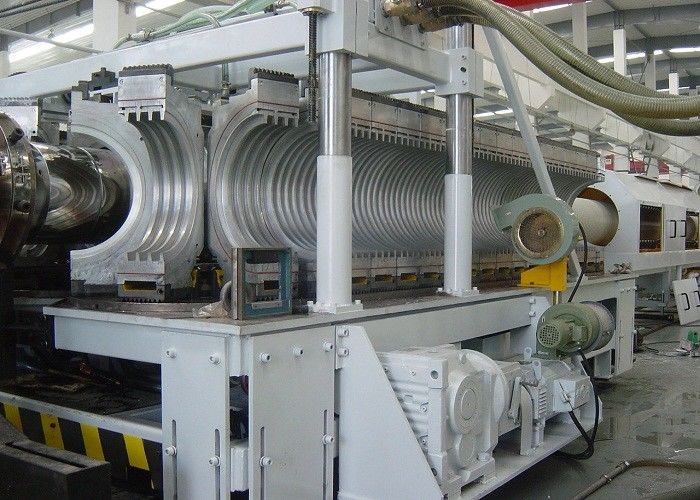 Corrugator is adopted horizontal structure with chain type transmission, equipped with forced air cooling system. It greatly increases the production speed. Mold moving adopts synchronous upper and lower mechanical drive system and advanced self-lubrication system. It assures moving accuracy and pipe quality stability.
