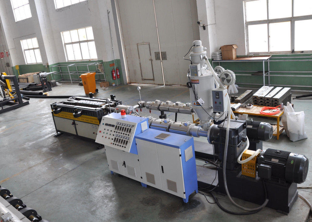This signle wall corrugated pipe extrusion line mainly contains extruder, corrugated forming machine, die head and mold blocks, cooling equipment, counting machine and winding machine. It can continuously produce many kinds of diameter single wall corrugated pipes.