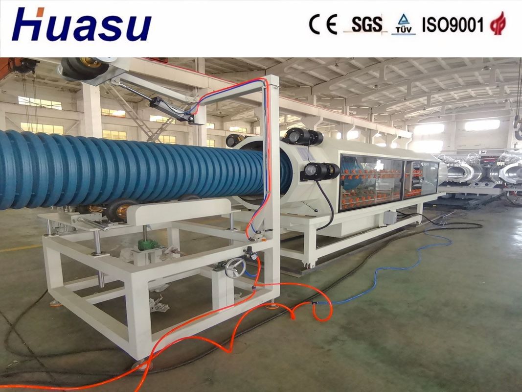 The double wall corrugated pipe line is the 3rd generation of the improved product of Shandong HUASU. The output of the extruder and the production speed of the pipe are greatly increased by 20-40% compared with the previous product.