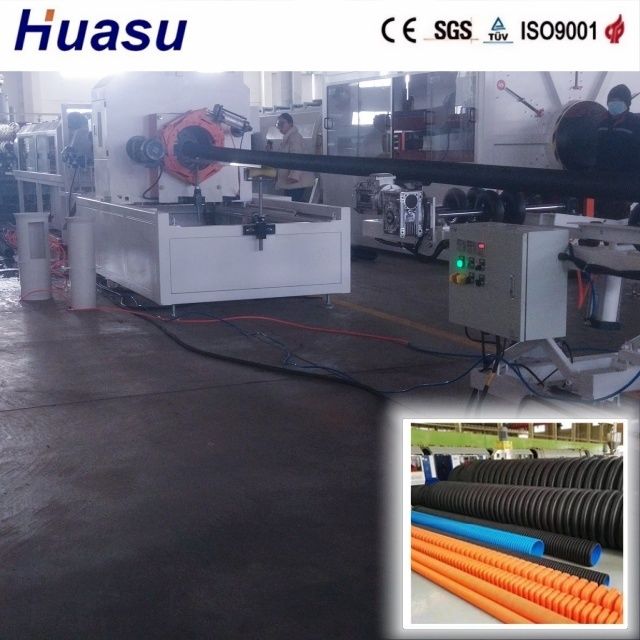 The double wall corrugated pipe line represents the 3rd generation of improved products from Shandong HUASU, featuring a 20-40% increase in extruder output and production speed compared to previous models. This system enables online belling to ensure optimal performance of finished corrugated pipe products. Utilizes Siemens PLC control system.