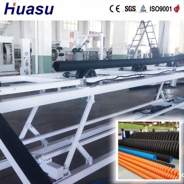 The double wall corrugated pipe line represents the 3rd generation improved product from Shandong HUASU, featuring 20-40% increased output and production speed compared to previous models. This system incorporates Siemens PLC control and enables online belling for optimal corrugated pipe performance.